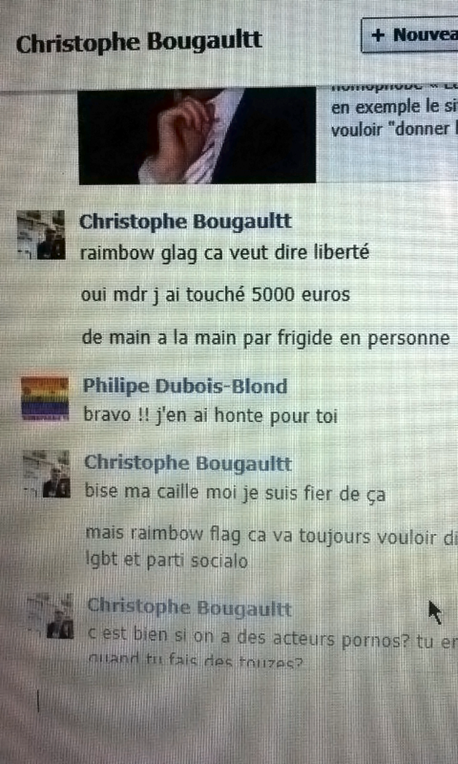 On est tombé sur des échanges étranges : Une preuve que les « Gays » témoignant contre la loi ont été payés par celle qui touche les ASSEDIC en tant que fausse intermittentE du spectacle et loge à 4 dans 175m2 dans un somptueux HLM … donc tout cela aux frais du contribuable !!!???? Votre avis compte !!