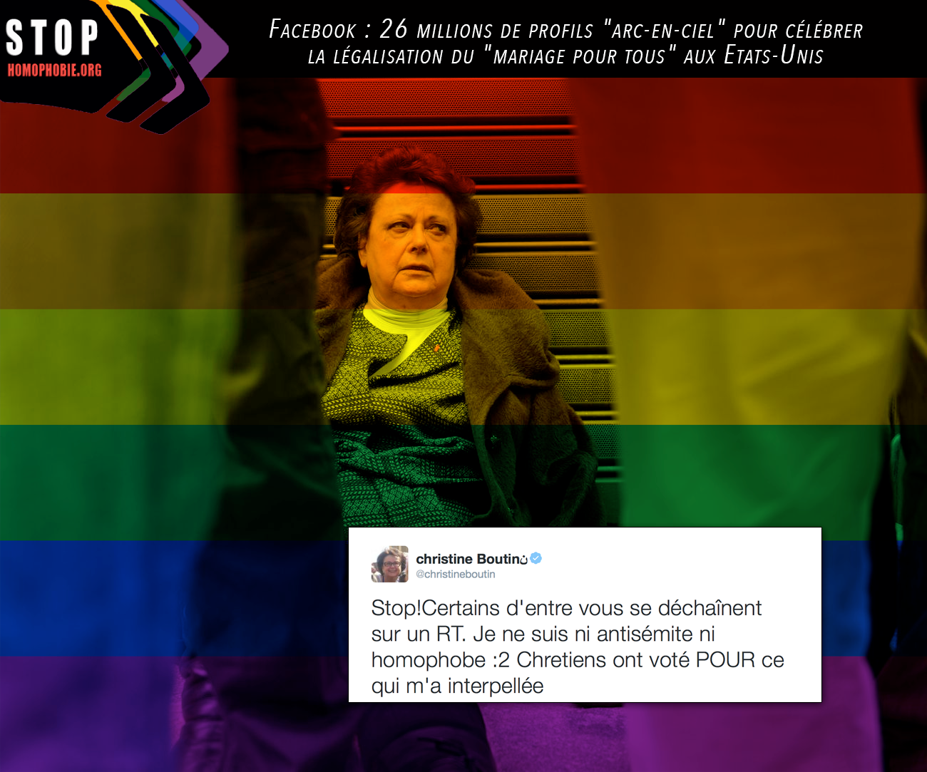 Assez simplement, le texte en question explique ainsi que la Cour suprême a pris sa décision car elle est « composée au tiers par des juifs ». Or, « 100% des juifs ont approuvé le mariage gay ». Vous comprenez qu’avec l’apport de deux voix de catholiques « traîtres libéraux », cette décision anti-civilisationnelle est passée comme une lettre à la poste. Après suppression du retweet, Christine Boutin a expliqué avoir été interpellée : « …sur les six juges catholiques, deux ont voté pour. Ça prouve qu’il n’y a pas qu’en France que la mariage gay divise les cathos ».
