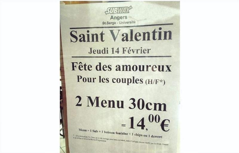 À Angers, les clients sont furieux et l’ont fait savoir aux employés du restaurant Subway Saint-Serge. L’affiche qui dérange a été retirée dans la matinée à la demande de l’enseigne nationale. Placardée sur la porte jeudi, jour de la Saint-Valentin, elle mentionnait ceci : « Fête des amoureux pour les couples (H/F) ». Avec, en petits caractères, un astérisque renvoyant à la mention suivante : «Discrimination (?) : Non, la loi sur le mariage pour tous a avancé, mais n’est pas encore ratifiée par le Sénat. Jusque là j’utilise la loi de la liberté d’expression.»