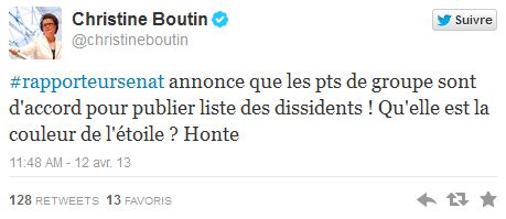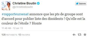 Aussi quelle ne fut pas notre désolation en lisant le tweet délétère de Madame Boutin apprenant que le Sénat venait d’approuver à mains levées l’adoption de la loi du mariage pour tous !