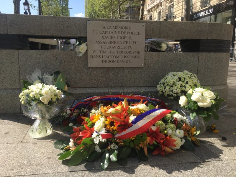 Ils ont déposé une gerbe et dévoilé une plaque commémorative « à la mémoire du capitaine de police Xavier Jugelé, assassiné en ce lieu le 20 avril 2017, victime du terrorisme dans l’accomplissement de son devoir ».