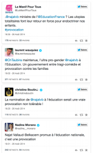 « La nouvelle ministre est en effet à l’origine des très controversés ‘ABCD de l’Egalité’ devenu ‘Plan égalité’ qui sous couvert d’égalité entre fille et garçon contribue en réalité à prôner l’indifférenciation des sexes et à diffuser l’idéologie du genre à l’école », a déclaré dans un communiqué la Manif pour tous, sitôt le nom de Najat Vallaud-Belkacem dévoilée. L’association qui s’était fait connaître en luttant contre le mariage gay, a fait de ces « ABCD » son nouveau combat.