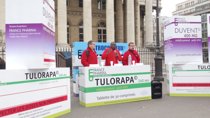Organisée par les associations de lutte contre le sida Aides et Coalition Plus, l’action s’est déroulée sur la place de la Bourse (2ème arrondissement) où une dizaine de boîtes de médicaments géantes aux noms évocateurs comme TULORAPA 200 mg ou DUVENT 500 mg avaient été installées.