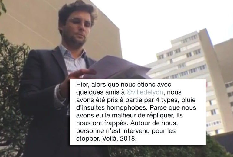 Simon, 28 ans, et cinq de ses amis venus de Paris pour passer le week-end à Lyon, ont été agressés dans l’après-midi du dimanche 7 octobre, place Bellecour, la plus grande place de la ville, par quatre hommes d’une vingtaine d’années, qui se sont enfuis ensuite dans le métro. « Salut les filles », « sale pédé » et puis les coups. Simon a écopé de trois jours d’ITT (incapacite totale de travail).