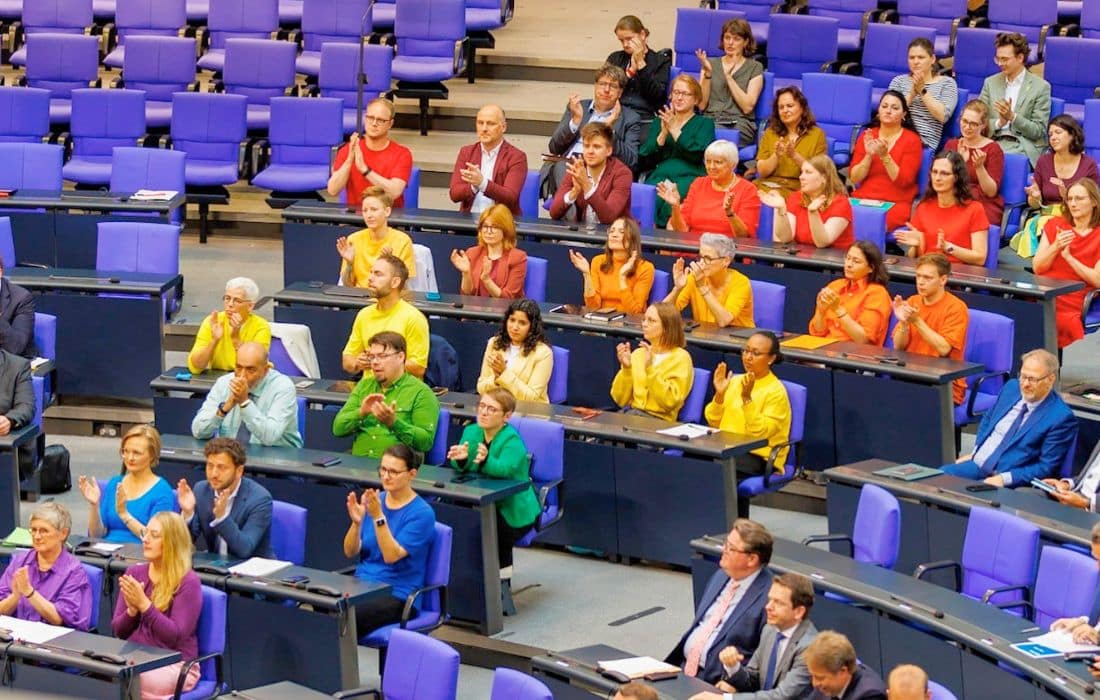Pour protester contre cette décision, lors d’une séance au Bundestag, le 26 juin, les députés du parti écologiste, Die Grünen, se sont finalement habillés aux couleurs de l’arc-en-ciel, symbole universel de la communauté LGBTQ+, et se sont disposés sur plusieurs rangs afin de former un véritable drapeau arc-en-ciel humain au cœur de l’hémicycle.