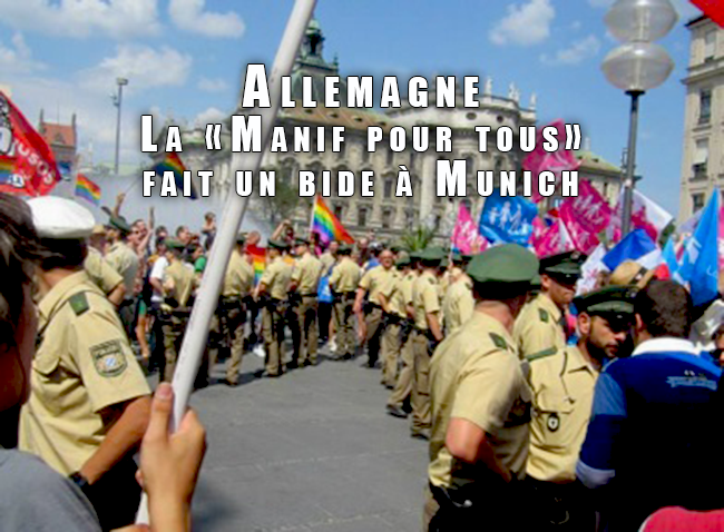 La tentative de rallier l’Allemagne au mouvement lancé par l’extrême droite et le cathos conservateurs en France n’a pas attiré beaucoup de sympathisants, ce samedi après-midi à Munich. Seule une petite centaine de personnes se sont rassemblées sur le Stachus, une des principales places de la ville, sous les drapeaux bleu-blanc-rose (et bleu-blanc-rouge), en compagnie de quelques représentants de l’extrême droite locale. Il s’agissait du point d’orgue d’un «pèlerinage» du collectif français sur les traces de Benoît XVI.