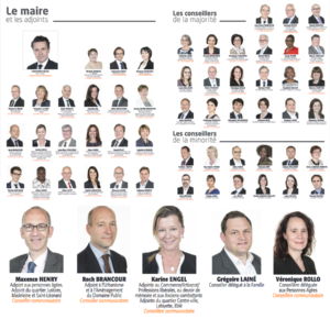 Maxence Henry et Roch Brancour, tous deux adhérents à Sens commun, mouvement issu de la Manif pour tous, infiltré au sein de la droite parlementaire traditionnelle. Karine Engel, adjointe aux anciens combattants (Les Républicains toujours). Ainsi que les conseillers Grégoire Lainé (MoDem), délégué à la famille, et Véronique Rollo, déléguée aux Personnes Agées, qui assure toutefois de son côté ne pas être « encartée » et pas plus adhérente à Sens commun.