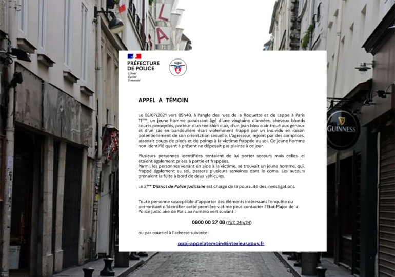 Appel à témoins après une agression homophobe survenue vers 5h40 le 5 juillet dernier, à l’angle des rues de la Roquette et de Lappe, près de la Bastille, dans le 11e arrondissement de Paris. La victime, un jeune homme, a été rouée de coups par plusieurs individus.