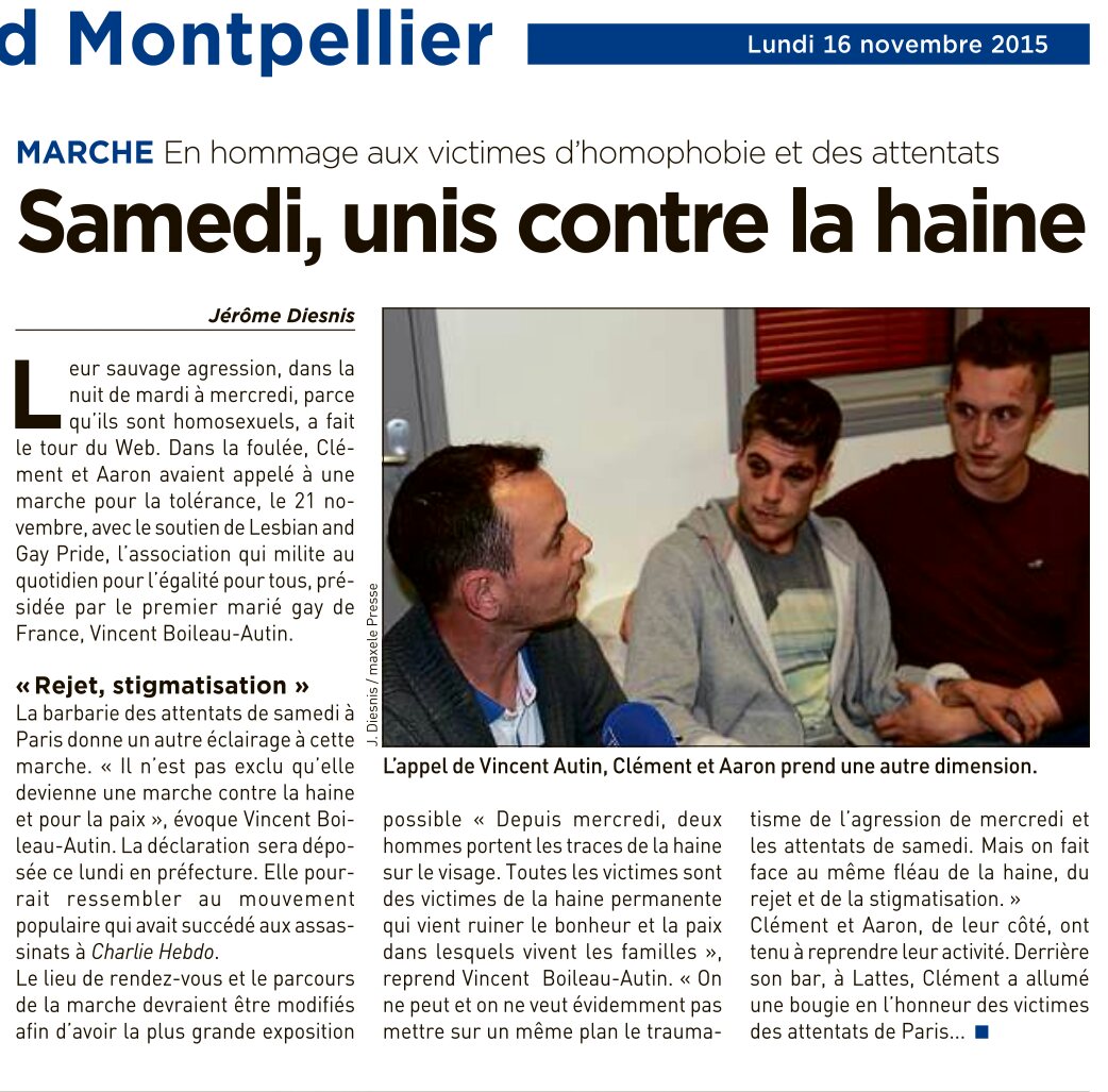Victimes d’une violente agression, dans la nuit de mardi à mercredi, parce qu’ils sont homosexuels, Clément et Aaron avaient appelé à une marche pour la tolérance, avec le soutien de la Lesbian and Gay Pride et du Club de la presse du Languedoc-Roussillon. Mais, la barbarie des attentats à Paris donne un autre éclairage à cette mobilisation :