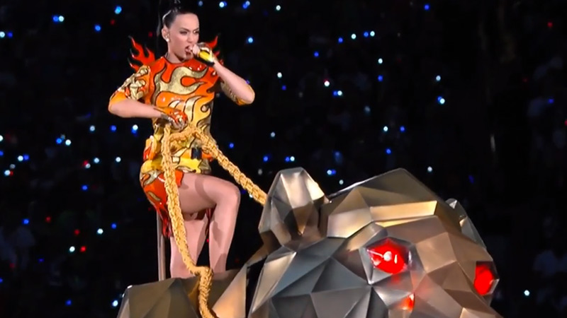 Illuminatis et sorcellerie, tout feu, tout flamme, « tunées » sur lion futuriste, requins danseurs… Dimanche dernier, la chanteuse assurait la mi-temps du célèbre championnat annuel de football américain, pendant lequel elle a livré un show pop exceptionnel, alliant la qualité à l’amusement et faisant preuve d’une énergie rafraîchissante.