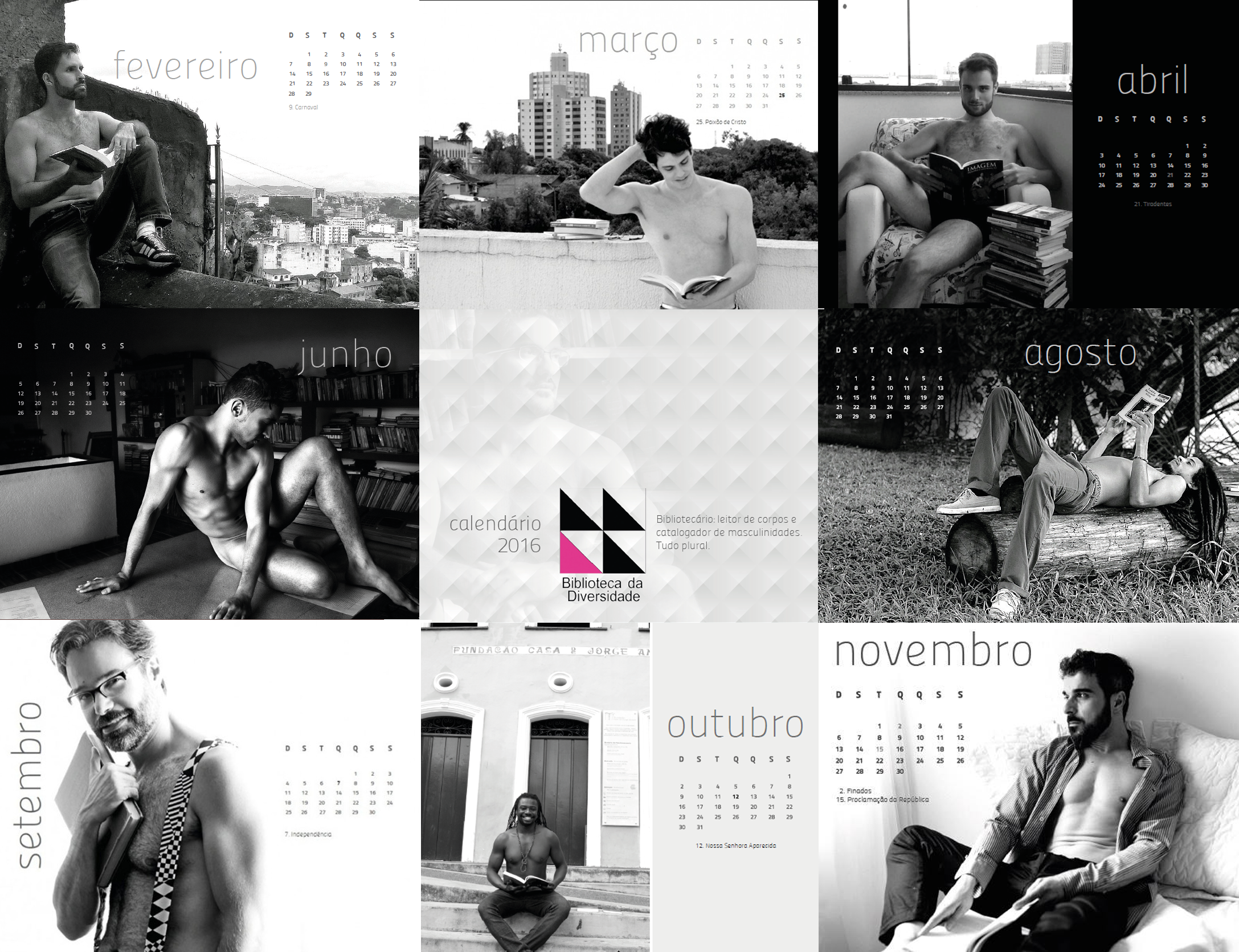 >> Precisando arrecadar fundos para construir a Biblioteca da Diversidade, um espaço destinado a fomentar o diálogo entre minorias religiosas e sexuais, 12 bibliotecários e estudantes tiraram a roupa e posaram nus para um calendário. Os modelos, de sete Estados diferentes, posaram voluntariamente.