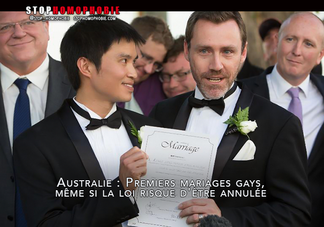 Les premiers mariages gays d’Australie ont été célébrés samedi à Canberra, même si la loi qui autorise le mariage entre personnes du même sexe dans la capitale australienne risque d’être annulée la semaine prochaine par la justice fédérale.
