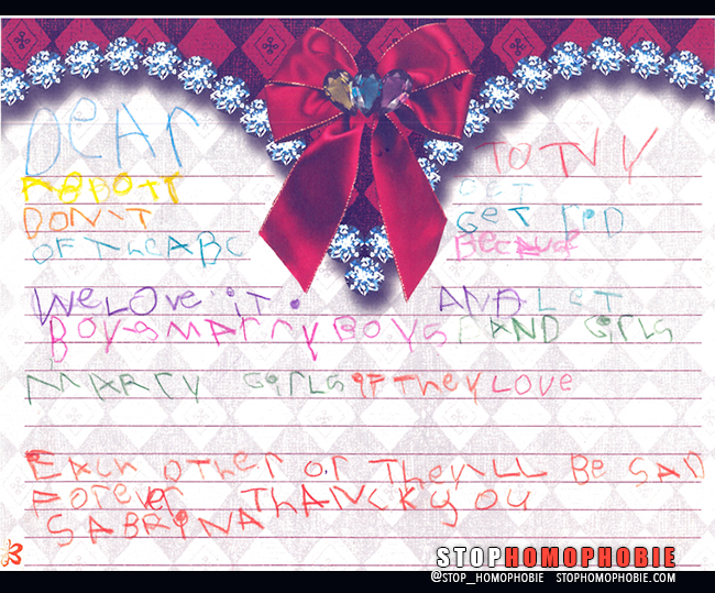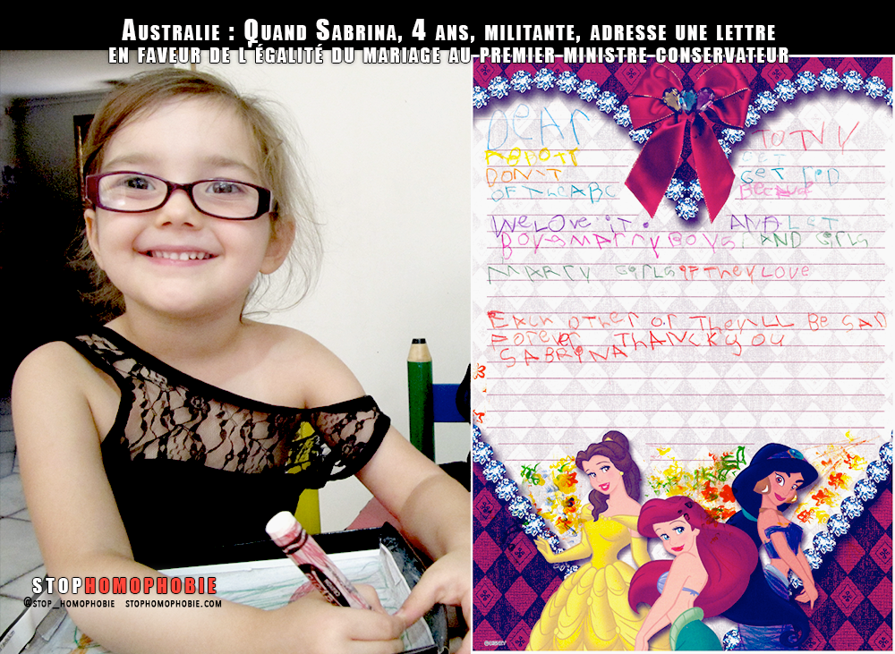 Toute une réflexion à suivre donc : Si une fillette peut saisir l’importance de l’égalité du mariage, peu importe le sexe, pourquoi pas le premier ministre Tony Habbott qui d’ailleurs, malgré les demandes adressées à son cabinet, n’a pas encore répondu à la lettre de Sabrina .