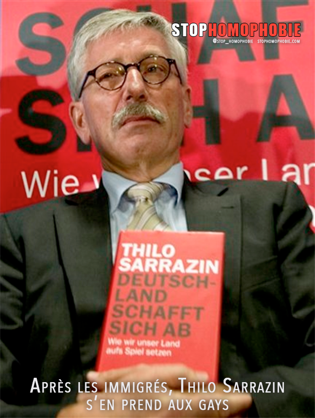 «M. Sarrazin est apparemment guidé par haine et par la misanthropie. Ses remarques homophobes et racistes le rapprochent plus du NPD (cypto-néonazi, ndlr.) que de la social-démocratie», a estimé Jan Stöß, ministre berlinois du SPD. En 2010, Thilo Sarrazin avait été au cœur d’une vaste controverse avec la sortie de son livre «Deutschland schafft sich ab» (L’Allemagne court à sa perte) – un immense succès de librairie où le ténor du SPD s’en prenait à la politique migratoire allemande, un système «qui produit constamment de nouvelles petites filles à foulard». Il avait failli être exclu de son parti… jusqu’à ce qu’il s’engage à ne plus remettre en cause les bases de la social-démocratie dans ses déclarations publiques.