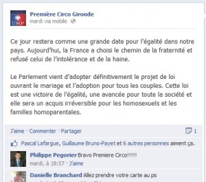 C’est la question que l’on est en droit de se poser quand on découvre la page Facebook de la 1ère circonscription UMP de Bordeaux. Le communiqué de Harlem Désir, 1er secrétaire du parti socialiste y est repris pour se féliciter de l’adoption de la loi Taubira : « Ce jour restera comme une grande date pour l’égalité dans notre pays. Aujourd’hui, la France a choisi le chemin de la fraternité et refusé celui de l’intolérance et de la haine ».