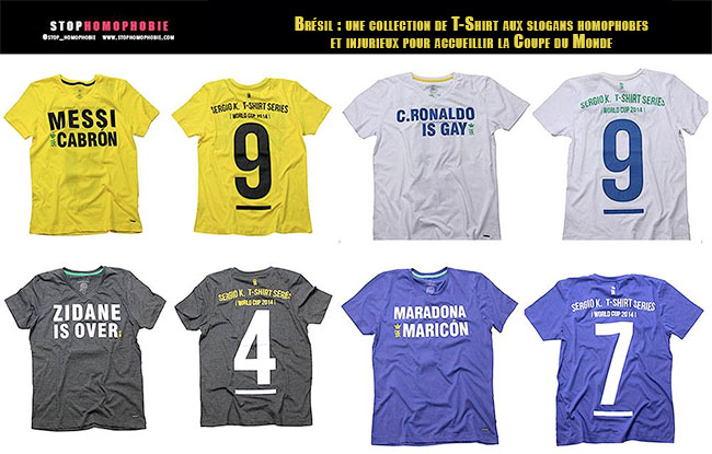 >> A T-shirt company preparing for the legions of soccer fans heading to Brazil for the World Cup has designed shirts emblazoned with homophobic language regarding some of the top players.