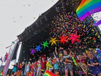 25 couples se sont ainsi mariés et 28 ont renouvelé leurs vœux, en présence de la comédienne Kate Clinton, dans le rôle de la « l’irrévérencieuse révérente » et de la chanteuse Suede qui a interprété pour l’occasion « Over The rainbow », avant l’échange traditionnel des alliances et une envolée de gants arc-en-ciel.
