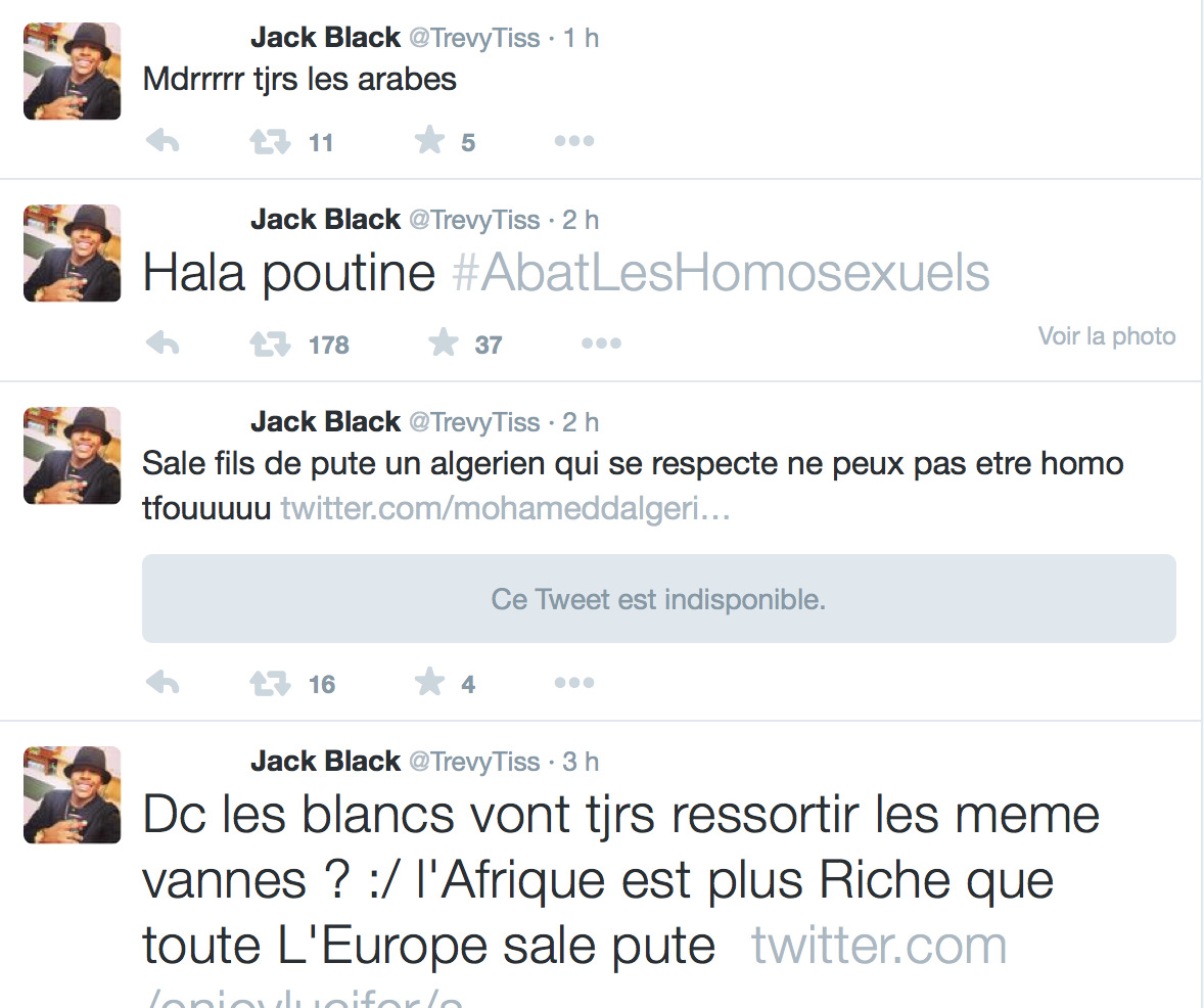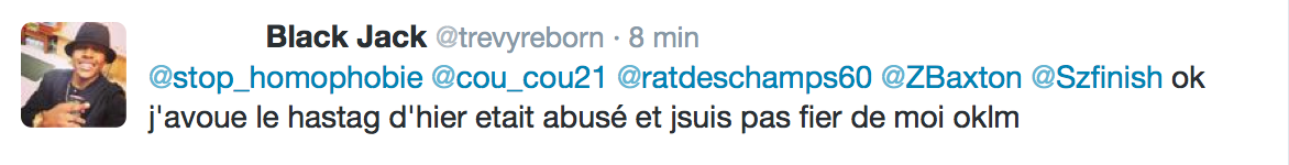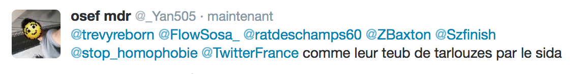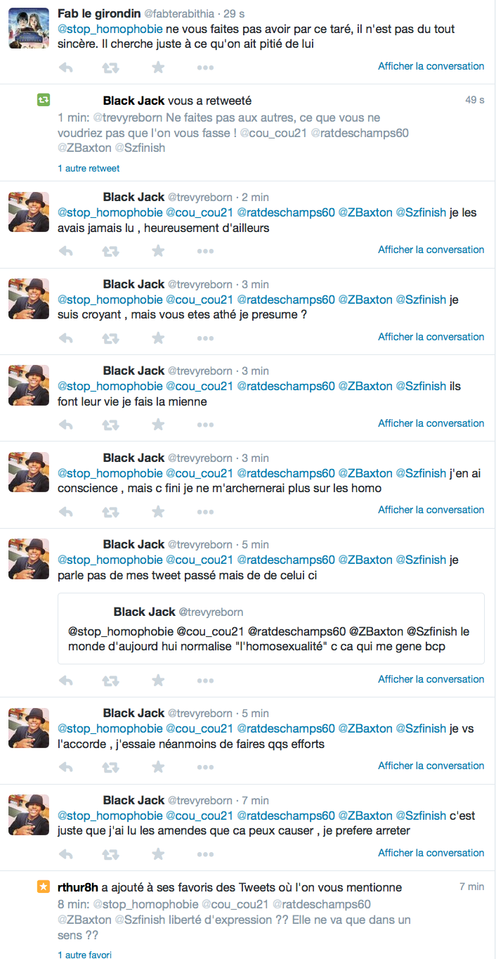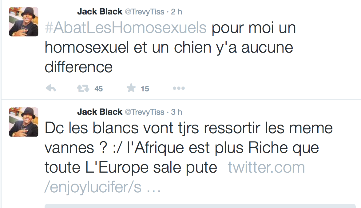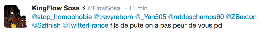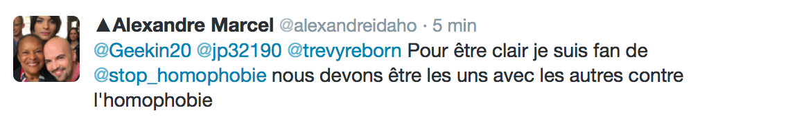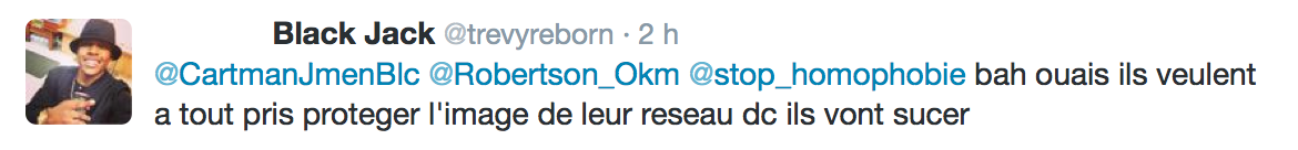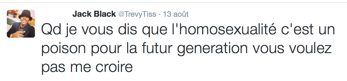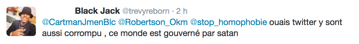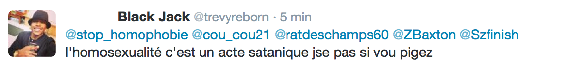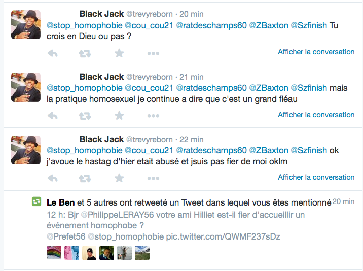 Accueil Société Cette obsession des homophobes : Trevy, une trentaine de comptes sur twitter dédiés à la haine Société Stop Homophobie TémoignageThe estimated reading time is less than a minute Cette obsession des homophobes : Trevy, une trentaine de comptes sur twitter dédiés à la haine Stop Homophobie 03/08/2016 Cette obsession des homophobes… [spacer] Post navigation Previous article Maroc : Human Rights Watch dénonce l’incarcération de deux hommes pour « homosexualité » Next article Le pape François regrette « qu’on apprenne à des enfants que tout le monde peut choisir son genre »