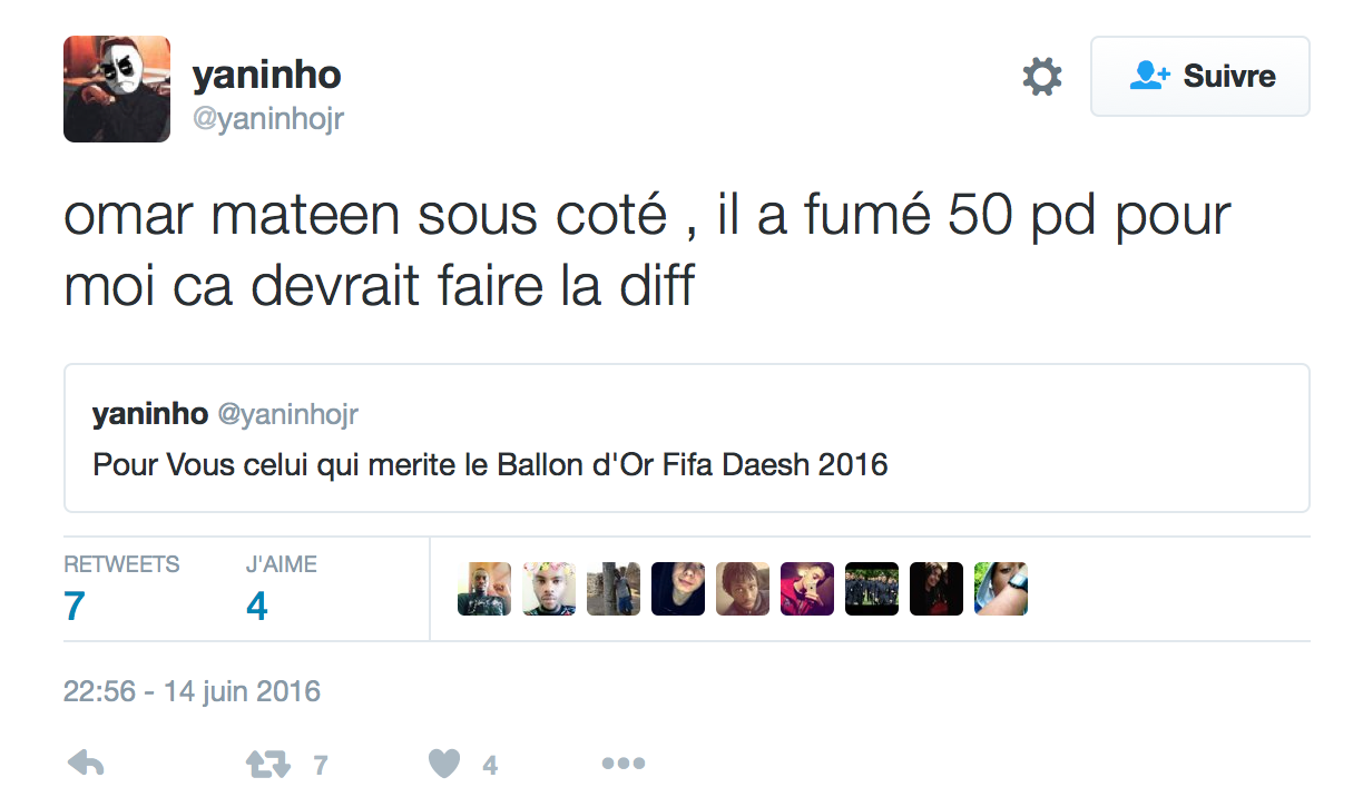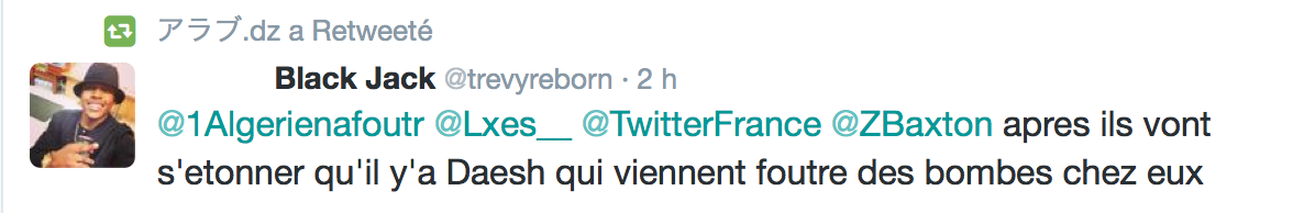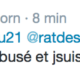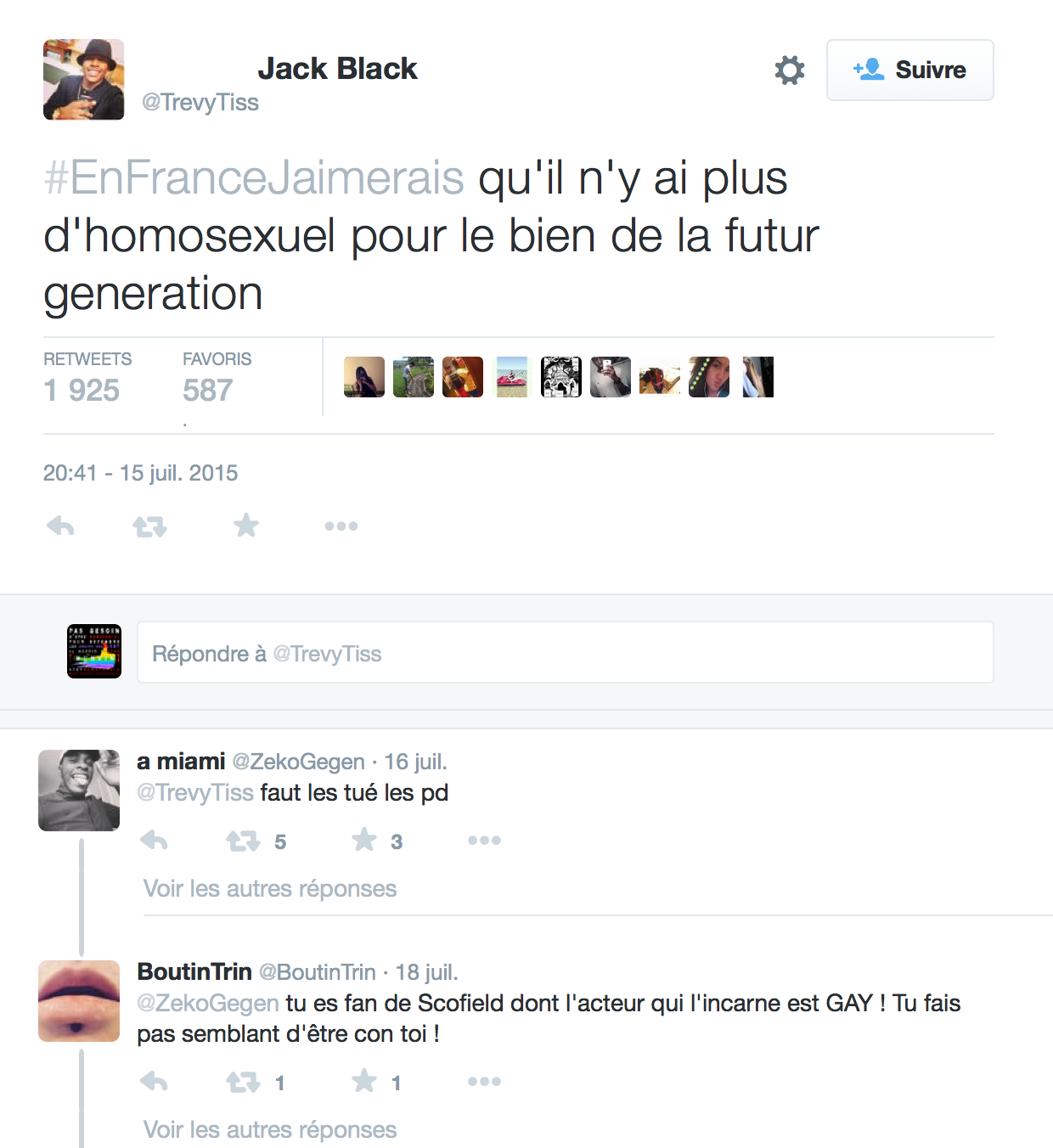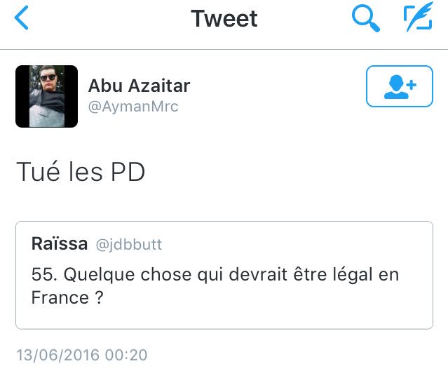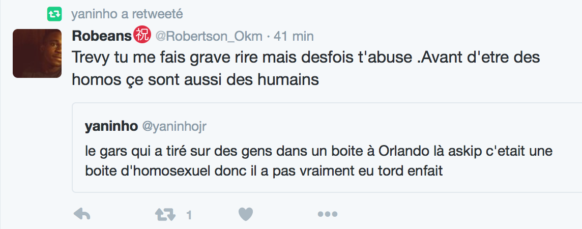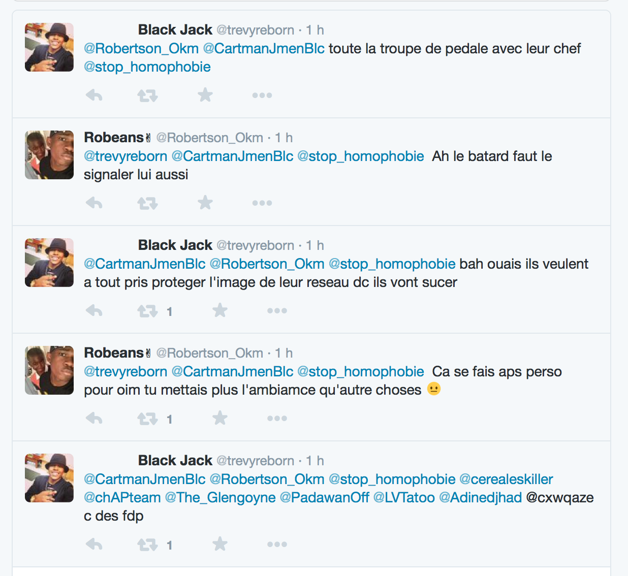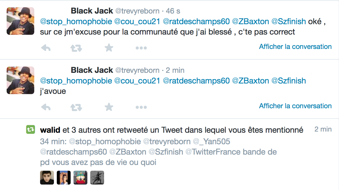 Accueil Société Cette obsession des homophobes : Trevy, une trentaine de comptes sur twitter dédiés à la haine Société Stop Homophobie TémoignageThe estimated reading time is less than a minute Cette obsession des homophobes : Trevy, une trentaine de comptes sur twitter dédiés à la haine Stop Homophobie 03/08/2016 Cette obsession des homophobes… [spacer] Post navigation Previous article Maroc : Human Rights Watch dénonce l’incarcération de deux hommes pour « homosexualité » Next article Le pape François regrette « qu’on apprenne à des enfants que tout le monde peut choisir son genre »