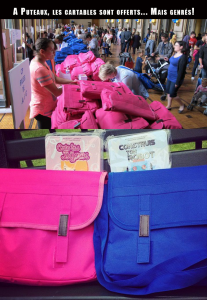 >> Pourquoi uniquement ces 2 couleurs ? Cartable rose avec un lot de bijoux pour les filles et cartable bleu avec un petit robot à construire pour les garçons… Il s’agit de ne pas se tromper de genre. Comme avant chaque rentrée scolaire, la mairie de Puteaux a organisé samedi 30 août une grande fête pour distribuer des cartables et des fournitures aux 4.500 écoliers de la ville.