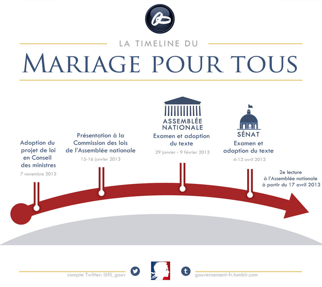 En conséquence, le projet de loi visant à ouvrir le mariage aux couples de personnes de même sexe sera inscrit à l’ordre du jour de l’Assemblée nationale à partir du mercredi 17 avril 2013.