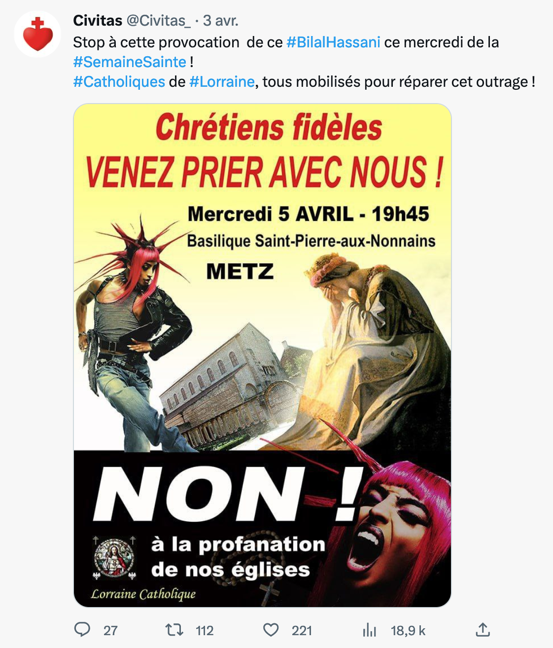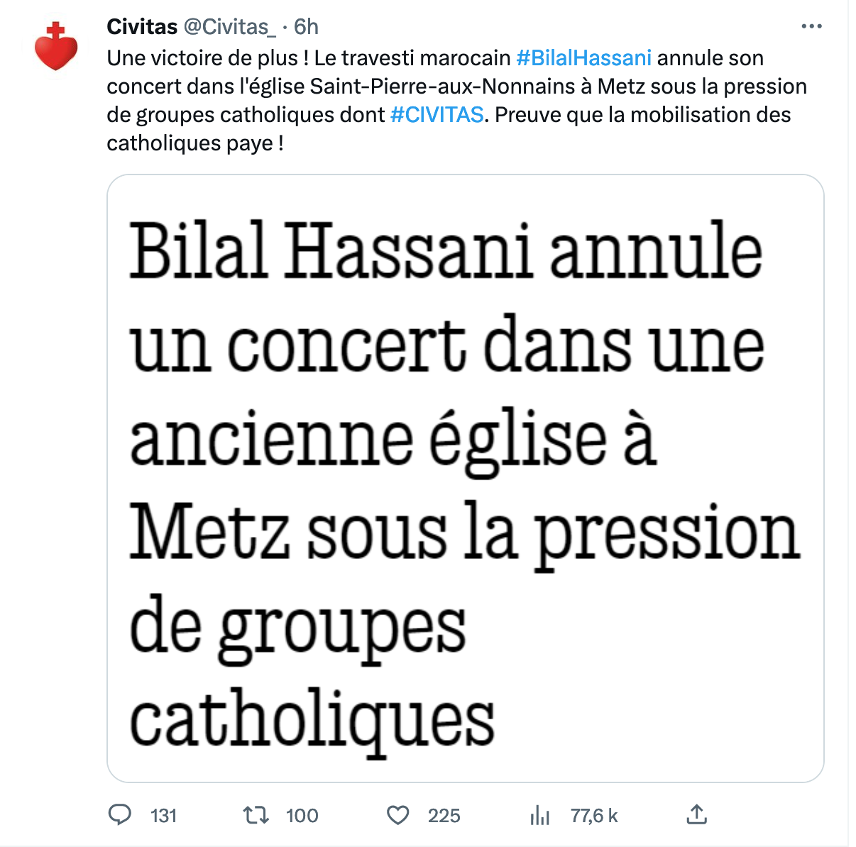 Bilal Hassani, 23 ans, devait se produire ce mercredi 5 avril dans l’ancienne basilique de Saint-Pierre-aux-Nonnains, située dans le centre-ville de Metz. Mais le concert a finalement été annulé après les menaces de catholiques radicaux, dont les intégristes de l’Institut Civitas, qui ont appelé à former un attroupement devant la salle, qualifiant notamment l’événement de « sacrilège », « outrage » et « profanation » d’un lieu saint par un « transsexuel ».