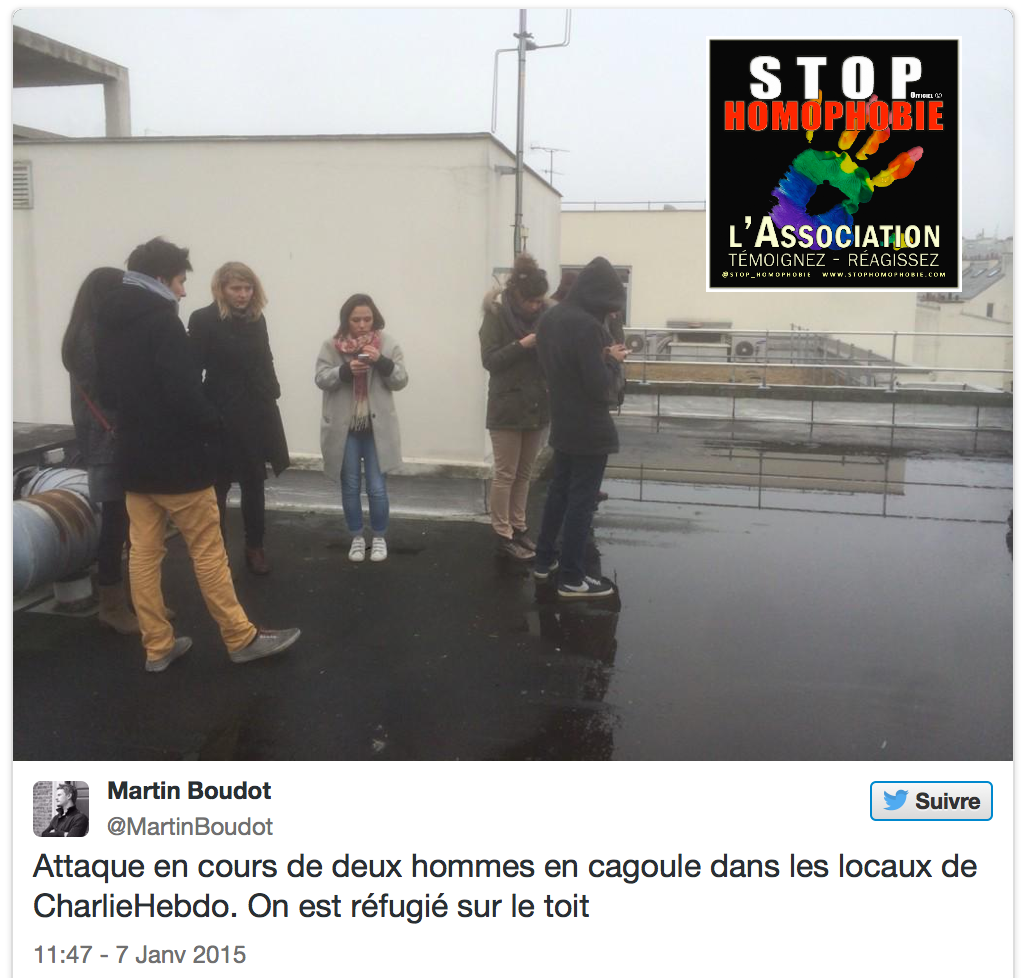 Attaque en cours de deux hommes en cagoule dans les locaux de CharlieHebdo. On est réfugié sur le toit pic.twitter.com/0TqFwIVJoF