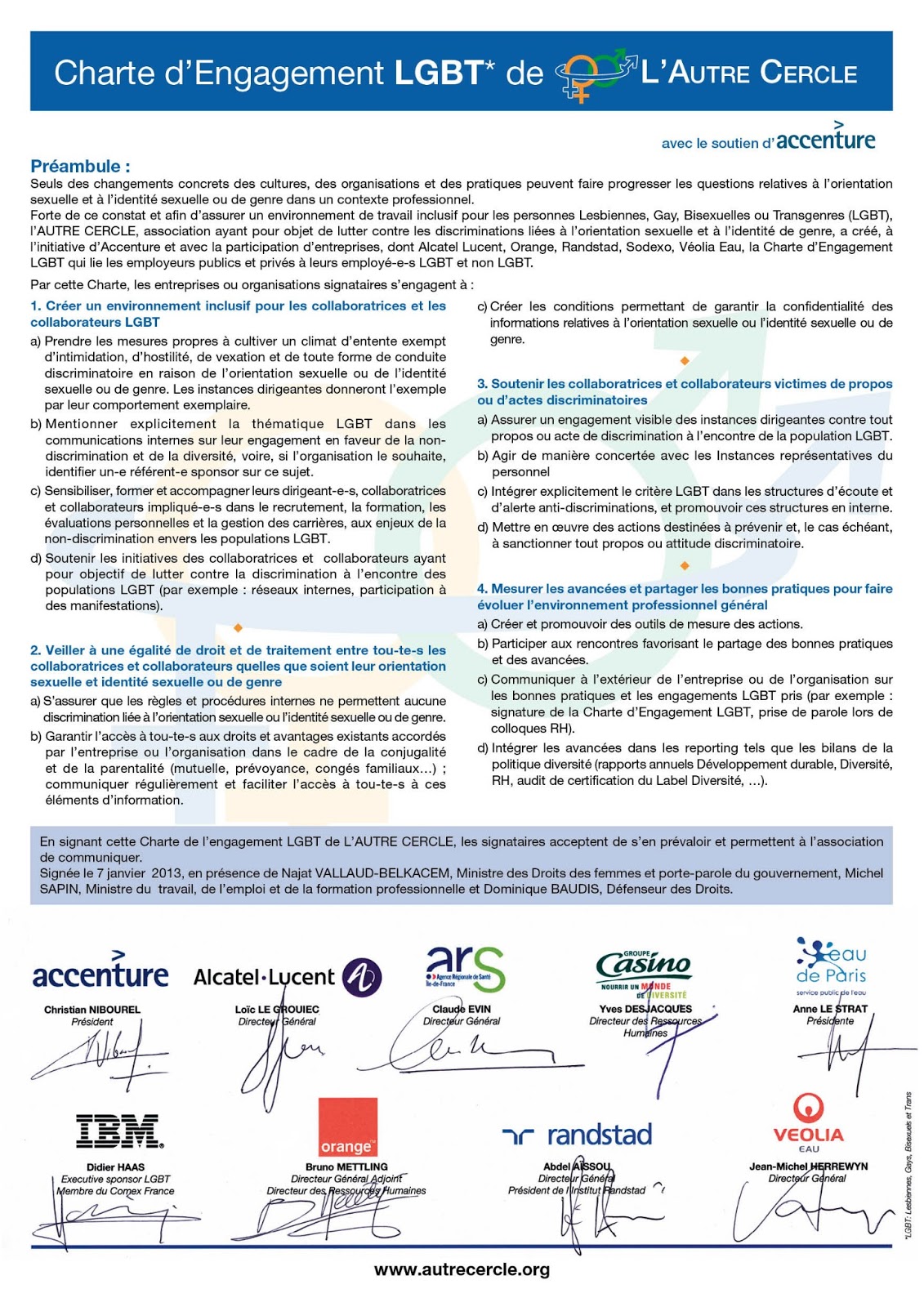 Les entreprises étaient ainsi représentées : Christian NIBOUREL président d’Accenture France, Loïc LE GROUIEC DG d’Alcatel Lucent France, Claude EVIN DG d’ARS Ile de France, Yves DESJACQUES DRH du groupe Casino, Anne LE STRAT présidente d’Eau de Paris, Didier HAAS membre du Comex d’IBM France, Bruno METTLING DGA-DRH du groupe Orange, Abdel AISSOU DG du groupe Randstad France et Jean-Michel HERREWYN DG de Véolia Eau ont signé la Charte de l’Engagement LGBT de L’Autre Cercle.