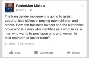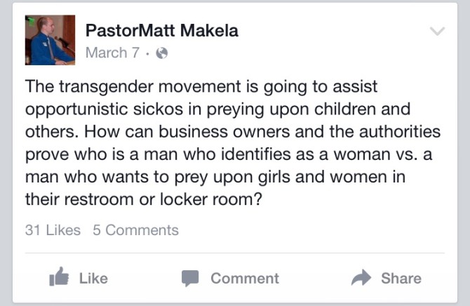 In a now deleted comment posted to an anti-gay marriage newspaper column penned by a fellow pastor, Makela compared homosexuality to alcoholism and suggested gay people could overcome same-sex attraction with enough support.