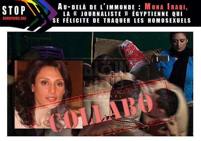 « Les signataires de cette déclaration condamnent fortement ce que cette présentatrice télé a fait. Elle a déshonoré de part ses agissements le métier de journaliste. Nous affirmons que c’est cette personne qui a violé la loi et non les hommes qui ont été arrêtés (…) Nous exigeons que Mona iraqi soit tenue responsable devant la loi pour avoir usé abusivement de sa profession afin de violer la vie privée d’autrui et les diffamer, ceci pour poursuivre des avantages professionnels sans tenir compte des conséquences. »