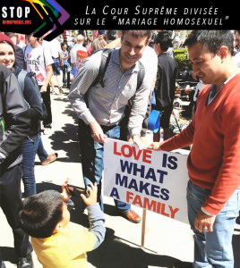 Deux ans après le premier round, la plus haute juridiction des Etats-Unis a arbitré le second lors d’une audience d’une durée exceptionnelle de deux heures et demie, immédiatement troublée par les hurlements d’un spectateur clamant « l’homosexualité est une abomination pour Dieu ».