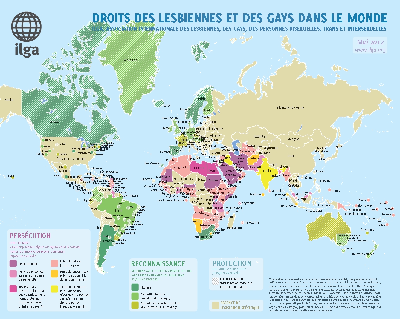 Pour des relations homosexuelles vous pouvez vous voir sortir avec un petit billet doux : « Peine de Mort » en Mauritanie, Nigéria, Soudan, Somalie, Arabie Saoudite et en Iran. D’autres pays sont plus sympas et ne vous propose qu’un simple voyage en prison, séjour qui vous promet au minimum 10 ans d’isolement pour avoir aimé, c’est le cas du Liban, de l’Ethiopie, du Kenya, de la Tanzanie, de l’Uganda, du Malawi, de la Zambie, du Ghana, la Sierra Leone, les Emirats Arabe Unis, le Bangladesh, la Malaisie, la Nouvelle Guinée et la Guyane
