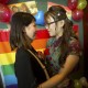 A rainbow flag hangs on the wall at the wedding. On top of it, the slogan reads: « Feminists longs for freedom. Lesbians want to get married. »