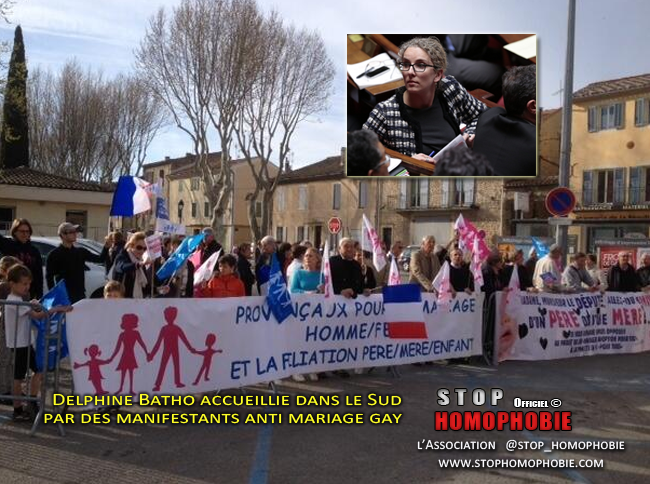 La ministre de l’Ecologie, Delphine Batho a été accueillie lundi par une trentaine de manifestants contre le mariage gay, alors qu’elle arrivait à la mairie de Lambesc (Bouches-du-Rhône), où elle effectuait un déplacement.