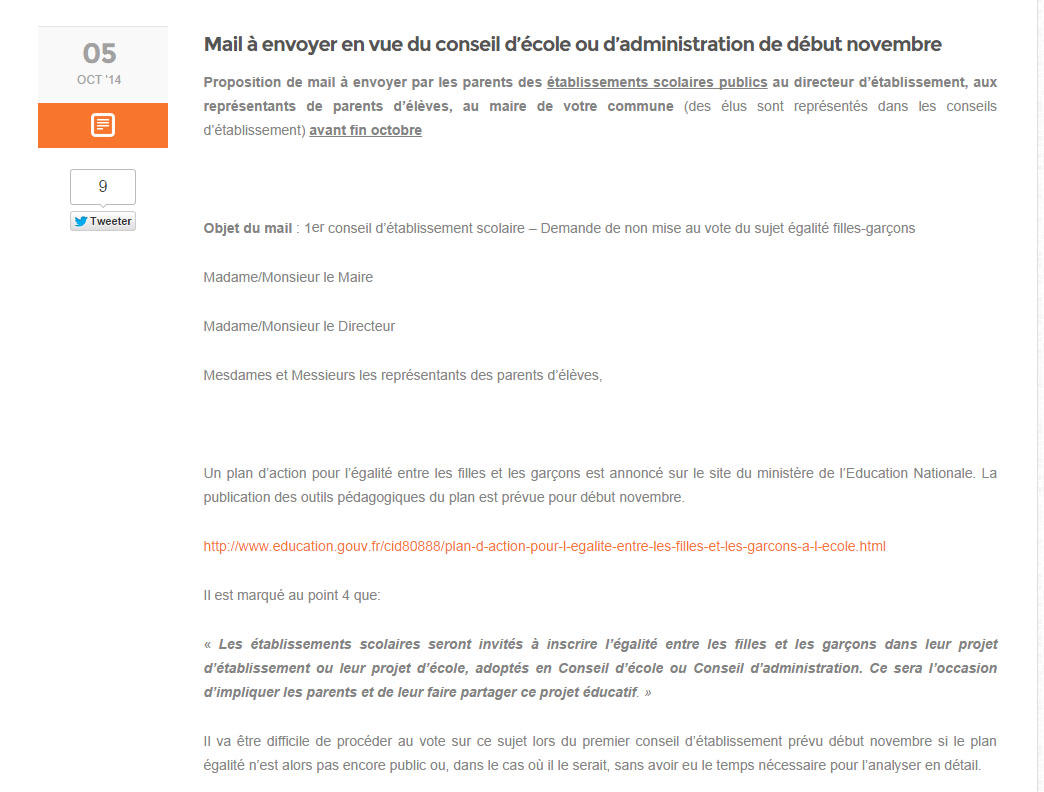 Info ou intox ? A la veille des élections des représentants de parents d’élèves qui se tiennent les vendredi 10 et samedi 11 octobre, des opposés à la prétendue « théorie du genre » à l’école, se seraient porté candidats sur des listes indépendantes.