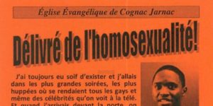 Intitulé « Délivré de l’homosexualité », le tract est signé de l’église évangélique de Cognac et Jarnac, et s’adresse « à une personne qui baigne encore dans ce combat spirituel qui est lié à la masturbation et la pornographie, qu’il est très important de se confier à quelqu’un de confiance, de ne pas garder ça en vous. Car, ce qu’on garde, ça germe, ça mûrit, et ça porte des mauvais fruits… »