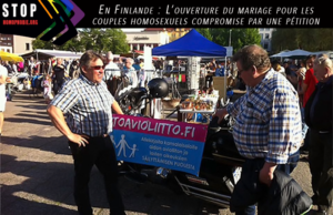 Alors que la Finlande, ex-modèle économique européen, traverse une crise similaire à celle de la France, avec un taux de chômage qui atteint des niveaux particulièrement élevés pour le pays, l’association « pour le vrai mariage », « copycat » de la Manif pour tous, vient d’annoncer ce 19 juillet avoir recueilli les 50.000 signatures requises par le système finlandais, pour exiger du Parlement un « réexamen » de la loi ouvrant le mariage aux couples de même sexe.