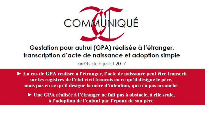 « En cas de gestation pour autrui réalisée à l’étranger, l’acte de naissance peut être transcrit sur les registres de l’état civil français en ce qu’il désigne le père, mais pas en ce qu’il désigne la mère d’intention, qui n’a pas accouché », précise la Cour, estimant en outre qu’« une GPA réalisée à l’étranger ne fait pas obstacle à l’adoption de l’enfant par l’époux de son père ». Elle avait reconnu pour la première fois le 3 juillet 2015 les pères « biologiques » d’enfants nés de GPA en Russie.