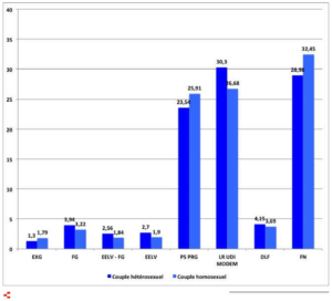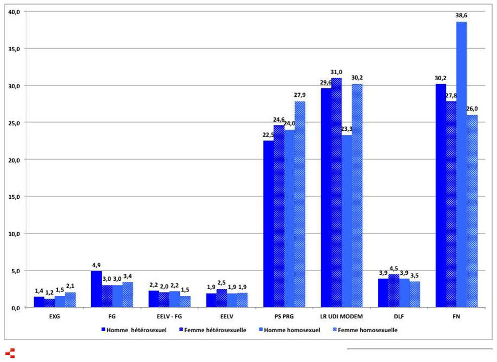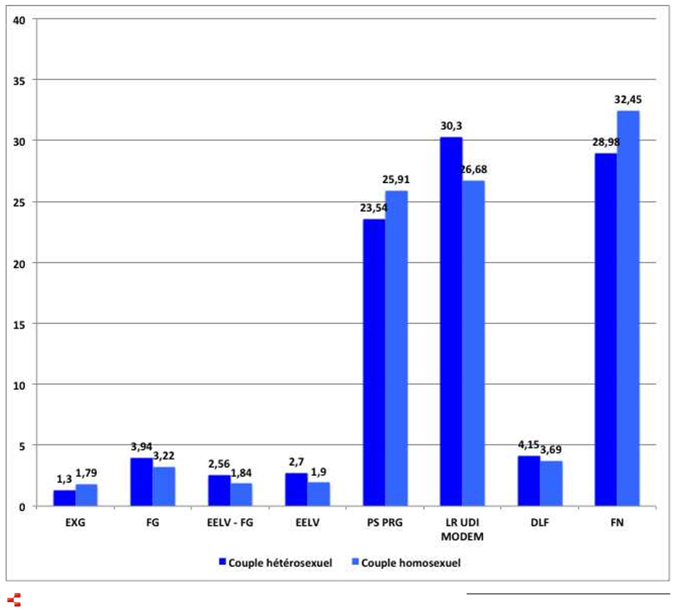 Les Républicains sont ceux qui perdent le plus : de 30,3% des voix chez les couples mariés hétérosexuels, ils tombent à 26,7% chez les conjoints homosexuels. Une conséquence possible de l’opposition farouche de certains élus à la loi Taubira sur le mariage, divisés entre les partisans d’une « réécriture » et ceux qui souhaitent son « abrogation ».