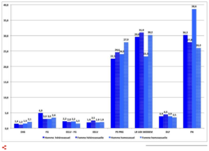 Au final, « l’orientation sexuelle » n’aurait statistiquement d’effet significatif que dans un seul cas. « À agglomération de résidence, âge, éducation et revenu par unité de consommation égaux, les répondants d’un couple homosexuel ont des chances plus élevées de voter PS, lorsque l’effet du genre du répondant est contrôlé. » En moyenne, les répondants des couples homosexuels ont une probabilité de voter PS supérieure de 5%.