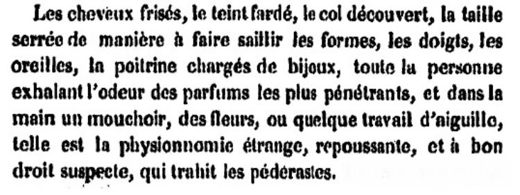 «Les cheveux frisés, le teint fardé, le col découvert, la taille serrée de manière à faire saillir les formes, les doigts, les oreilles, la poitrine chargés de bijoux, toute la personne exhalant l’odeur des parfums les plus pénétrants, et dans la main un mouchoir, des fleurs, ou quelque travail d’aiguille, telle est la physionomie étrange, repoussante, et à bon droit suspecte, qui trahit les pédérastes.»