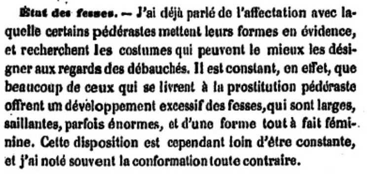 «J’ai déjà parlé de l’affection avec laquelle certains pédérastes mettent leurs formes en évidence, et recherchent les costumes qui peuvent le mieux les désigner aux regards des débauchés. Il est constant, en effet, que beaucoup de ceux qui se livrent à la prostitution pédéraste offrent un développent excessif des fesses, qui sont larges, saillantes, parfois énormes, et d’une forme tout à fait féminine. Cette disposition est cependant loin d’être constante, et j’ai noté souvent la conformation toute contraire.»