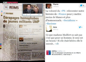 « La volonté du #PS : réinventer notre histoire de #France pour y mettre moins de blancs et plus d’homosexuels. Socialisme = Racisme » pouvait-on lire sur le compte de la liste des candidats Arnaud Robinet et Catherine Vautrin. Ou encore « Ce que Madame M. ne sait pas, c’est que pour un homme le sexe est un besoin. Si elle était hétéro, elle saurait. »