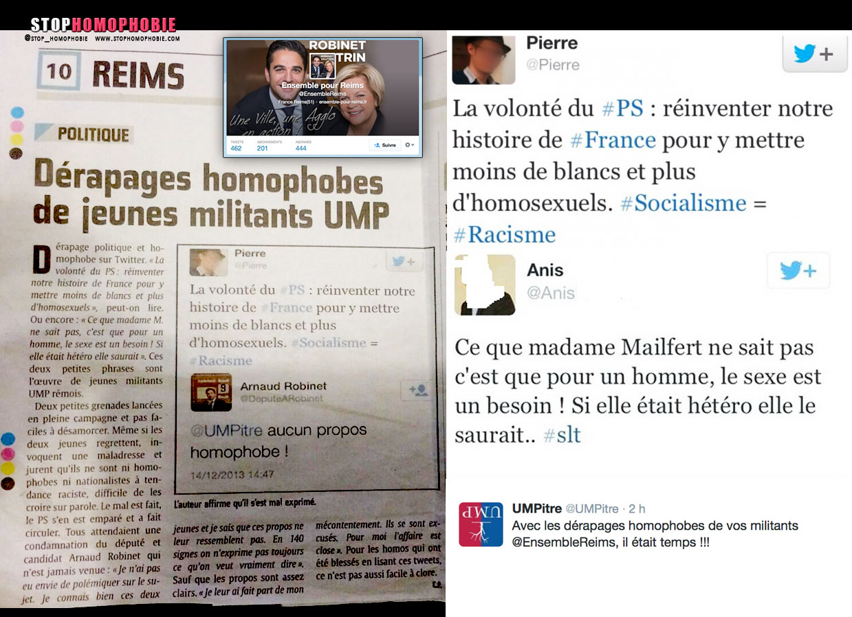 En pleine campagne, ces « phrases grenades » sont difficiles à désamorcer, même si l’œuvre de jeunes militants qui affirment s’être mal exprimés, et ne pas être homophobes ni racistes. Arnaud Robinet, n’a pas eu envie de polémiquer, ne s’explique pas sur ce dérapage : « Ils se sont excusés, l’affaire est close. »