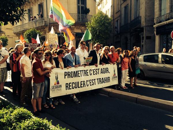 Malgré l’adoption, en 2013, de la loi sur le mariage pour tous, et la célébration, le 29 mai 2013 dans la ville du premier mariage homosexuel français, les banderoles ont rappelé que le combat continuait, affichant plusieurs des revendications, notamment pour la procréation assistée ou à la gestation pour autrui.