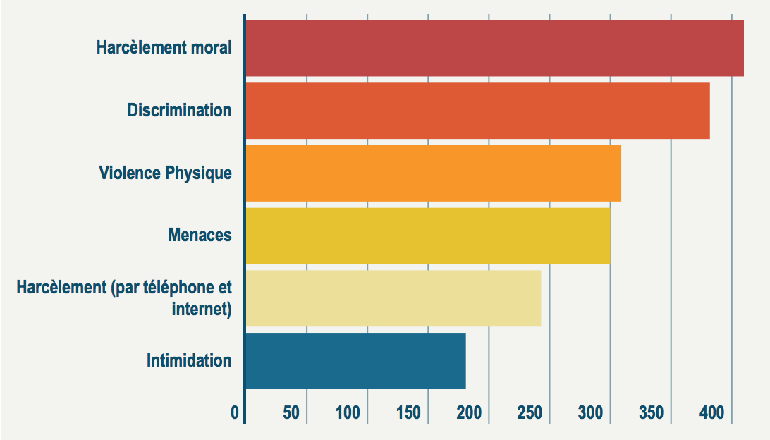 Plaisanteries maladroites ou mise à l’écart, si la majorité des personnes interrogées ont déclaré souffrir quotidiennement de harcèlement moral et de discrimination, plusieurs centaines dénoncent des violences physiques et menaces. Le harcèlement par téléphone et par internet a, de plus, nettement progressé.