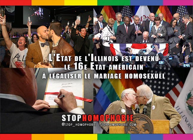 L’Etat de l’Illinois, dans le nord des Etats-Unis, est devenu ce mercredi le 16e Etat américain à légaliser le mariage homosexuel, quelques jours après l’adoption par les élus de Hawaii d’un texte similaire.