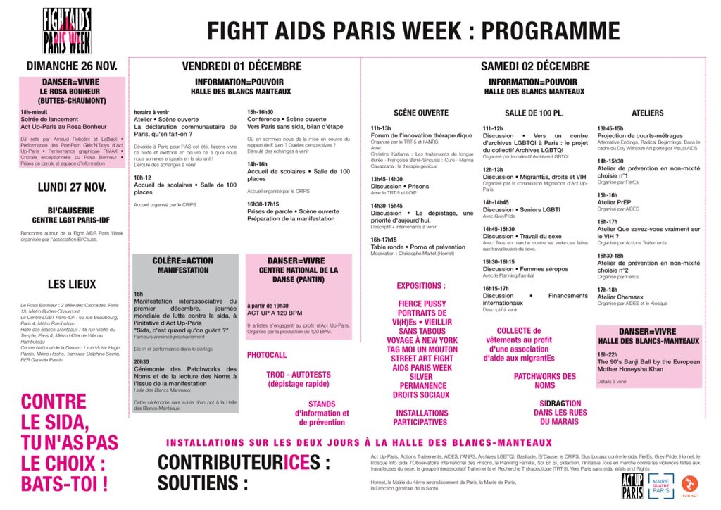 En amont de la journée mondiale de lutte contre le SIDA, Act Up-Paris et les associations parisiennes, en partenariat avec « Vers Paris Sans Sida », organisent, les 1er et 2 décembre, la Fight AIDS Paris Week : « Deux jours autour des luttes contre le sida en 2017 » pour débattre et comprendre, « entre animations, expositions et commémorations », ce qui nous reste à faire « pour mettre un terme aux contaminations, améliorer la qualité de vie des séropositifVEs, lutter contre les entraves à l’accès aux droits et aux soins à la prévention ».