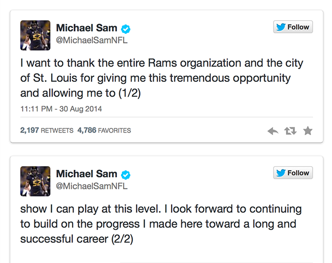 Sam avait été sélectionné en mai en 249e position lors du 7e tour de la Draft 2014, le rassemblement annuel qui permet aux équipes de la NFL de recruter les meilleurs joueurs universitaires.