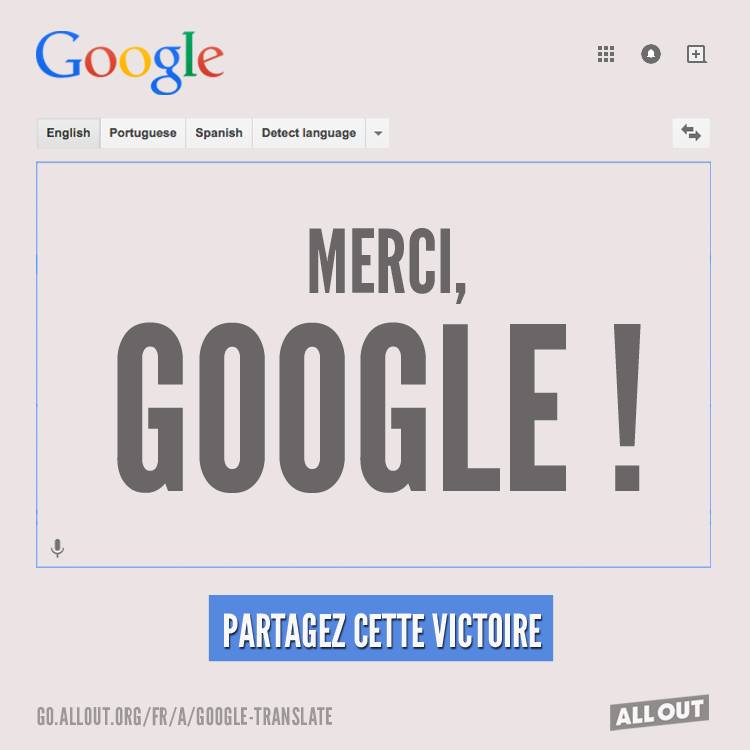 « C’est gagné ! Grâce à notre mobilisation, Google a corrigé ses codes ce vendredi pour retirer les insultes anti-gays de son outil de traduction », a annoncé mardi 27 janvier le collectif de défense des droits LGBT « All Out » dans un communiqué.